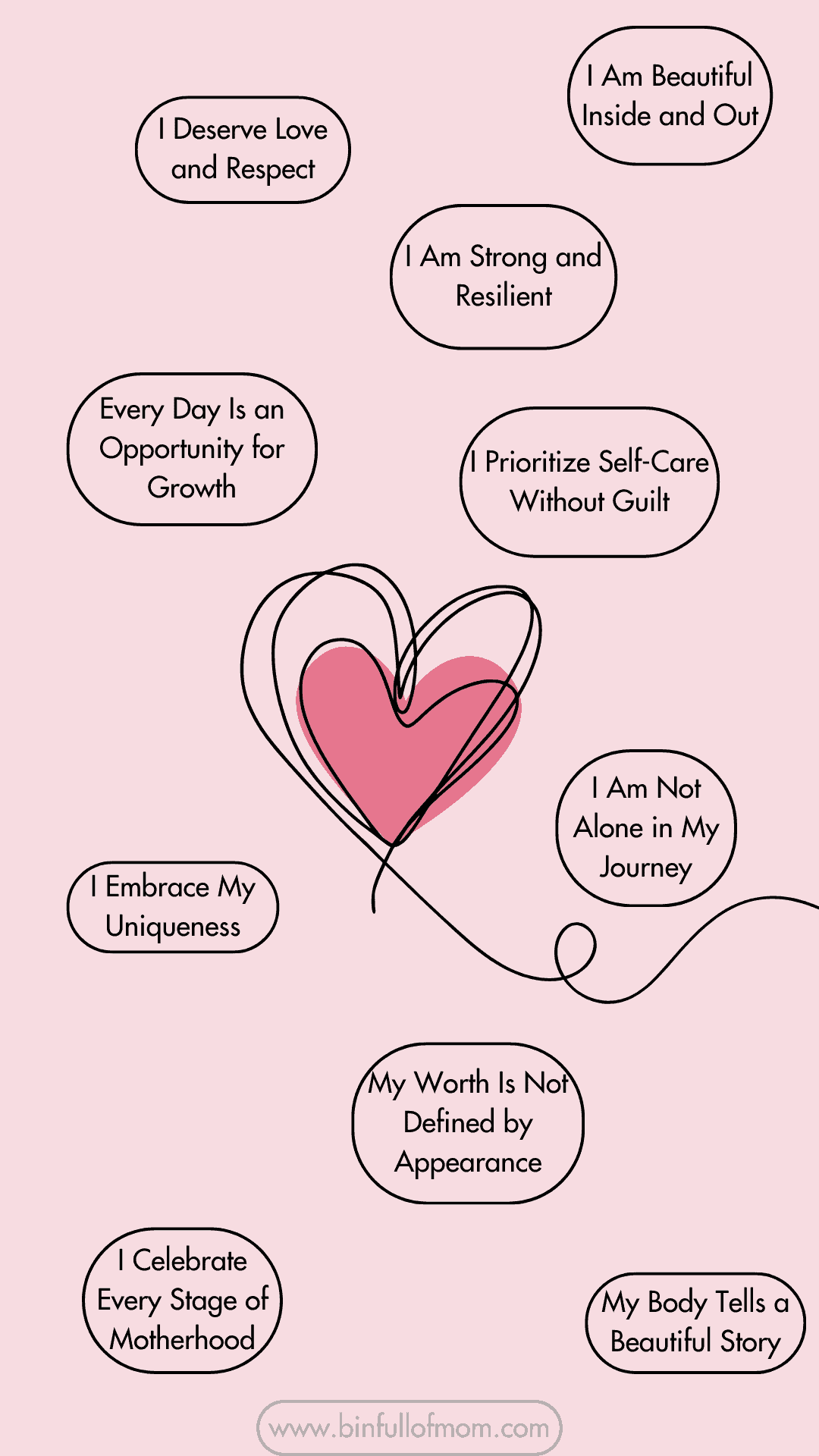 - “My Worth Is Not Defined by Appearance:” Affirmation: “I recognize that my value as a mother and an individual is not determined by societal beauty standards. My worth lies in the love, care, and dedication I provide for my family.”
